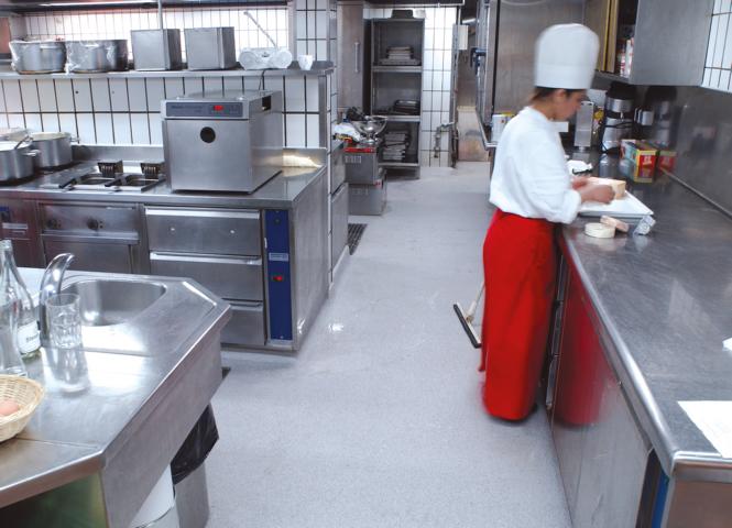 Vielfältig und anspruchsvoll sind die Dienstleistungen in Hotels, Restaurants, Großküchen, Cateringbetrieben und Gaststätten. Entsprechend groß die Erwartungen an einen zuverlässigen Boden. In Küchen, Toiletten, Waschräumen, Fluren, Kühlräumen, Keller- oder Lagerbereichen bilden deshalb Reaktionsharzböden von Silikal seit Jahrzehnten eine willkommene Lösung. Überall dort, wo’s richtig rund geht, wo mal was zu Boden fällt, wo Suppe schwappt oder Kästen schleifend über den Boden gezogen werden und wo natürlich ständig zu Reinigungsmitteln gegriffen wird, bewährt sich der Einsatz von Silikal-Böden. Durch hohe Abriebfestigkeit, verschiedene Rutschhemmstufen, attraktive Farben und Pflegeleichtigkeit tragen sie dazu bei, dass hinter den Kulissen von Hotels und Gastronomiebetrieben alles wie am Schnürchen läuft.